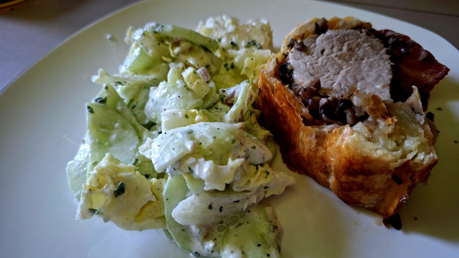 Pork tenderloin and mushrooms in puff pastry: A juicy pork tenderloin wrapped in chopped mushrooms and bacon in puff pastry—not just for the holidays.