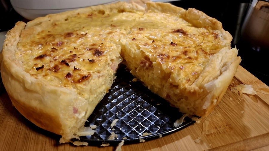 Meanwhile, dice the onions and fry them with the bacon cubes in a pan with butter until translucent. Whisk the eggs with the sour cream and seasonings. Fold in the grated cheese and mix with the cooled onion and bacon mixture.